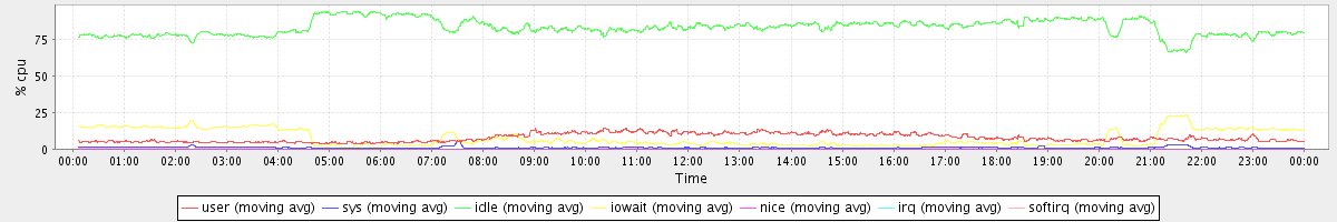 avg(user) = 7.71 avg(sys) = 1.06 avg(idle) = 83.37 avg(iowait) = 7.54 avg(nice) = 0.00 avg(irq) = 0.04 avg(softirq) = 0.29