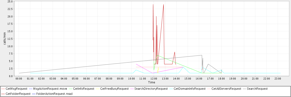 max(GetMsgRequest) = 3.00 max(MsgActionRequest.move) = 3.00 max(GetInfoRequest) = 7.00 max(GetFreeBusyRequest) = 3.00 max(SearchDirectoryRequest) = 4.00 max(GetDomainInfoRequest) = 3.00 max(GetAllServersRequest) = 3.00 max(SearchRequest) = 7.00 max(GetFolderRequest) = 24.00 max(FolderActionRequest.read) = 2.00