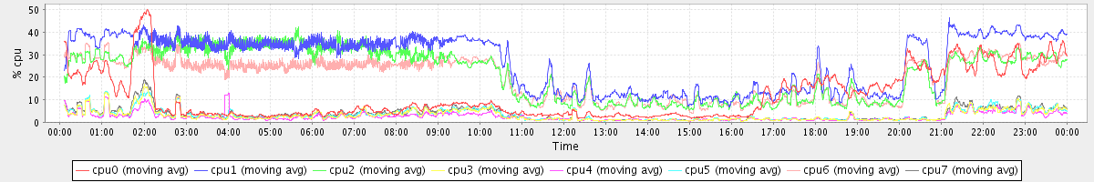 avg(cpu0) = 11.66 avg(cpu1) = 27.05 avg(cpu2) = 21.90 avg(cpu3) = 3.16 avg(cpu4) = 2.58 avg(cpu5) = 3.36 avg(cpu6) = 19.99 avg(cpu7) = 3.67