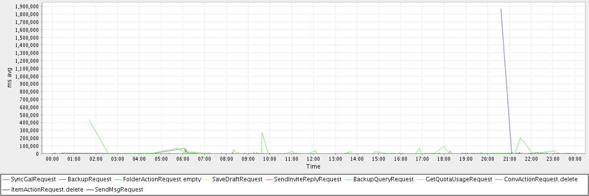 avg(SyncGalRequest) = 272.11 avg(BackupRequest) = 932068.00 avg(FolderActionRequest.empty) = 22773.14 avg(SaveDraftRequest) = 319.51 avg(SendInviteReplyRequest) = 707.50 avg(BackupQueryRequest) = 985.20 avg(GetQuotaUsageRequest) = 3205.00 avg(ConvActionRequest.delete) = 3008.40 avg(ItemActionRequest.delete) = 270.00 avg(SendMsgRequest) = 445.70