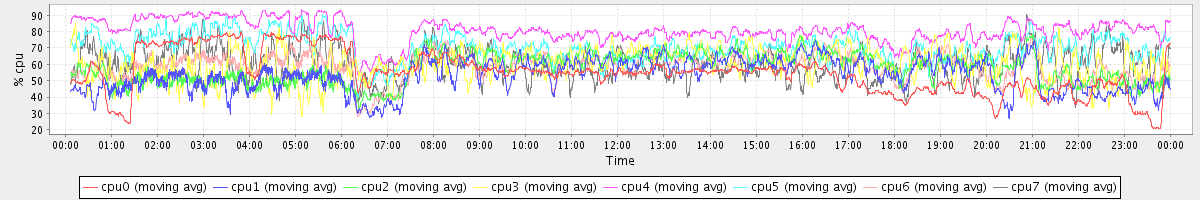 avg(cpu0) = 54.99 avg(cpu1) = 53.33 avg(cpu2) = 57.54 avg(cpu3) = 59.98 avg(cpu4) = 80.64 avg(cpu5) = 70.36 avg(cpu6) = 58.71 avg(cpu7) = 60.17
