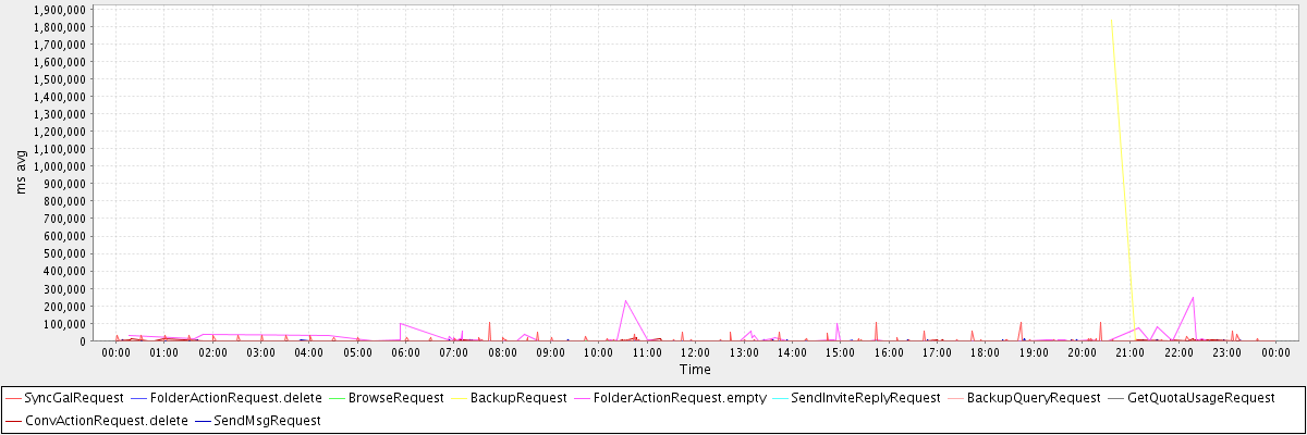 avg(SyncGalRequest) = 1621.44 avg(FolderActionRequest.delete) = 1226.50 avg(BrowseRequest) = 343.00 avg(BackupRequest) = 917786.00 avg(FolderActionRequest.empty) = 13532.88 avg(SendInviteReplyRequest) = 882.33 avg(BackupQueryRequest) = 824.20 avg(GetQuotaUsageRequest) = 3063.00 avg(ConvActionRequest.delete) = 1421.60 avg(SendMsgRequest) = 409.04