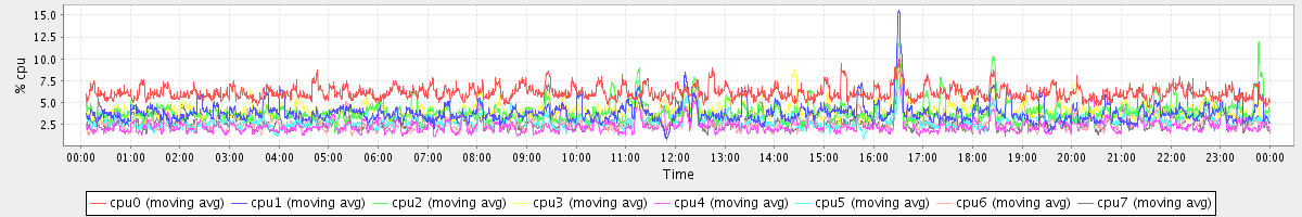 avg(cpu0) = 6.09 avg(cpu1) = 3.81 avg(cpu2) = 3.95 avg(cpu3) = 4.14 avg(cpu4) = 2.37 avg(cpu5) = 2.95 avg(cpu6) = 2.77 avg(cpu7) = 2.72