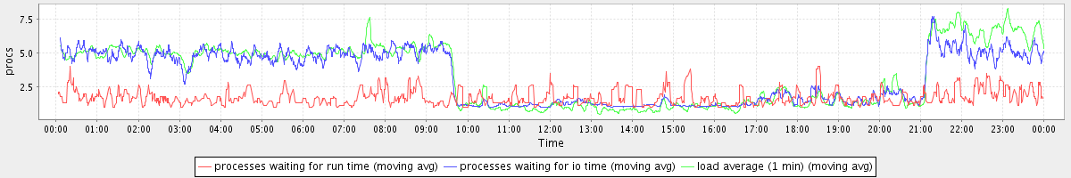 avg(processes waiting for run time) = 0.83 avg(processes waiting for io time) = 3.06 avg(load average (1 min)) = 3.44