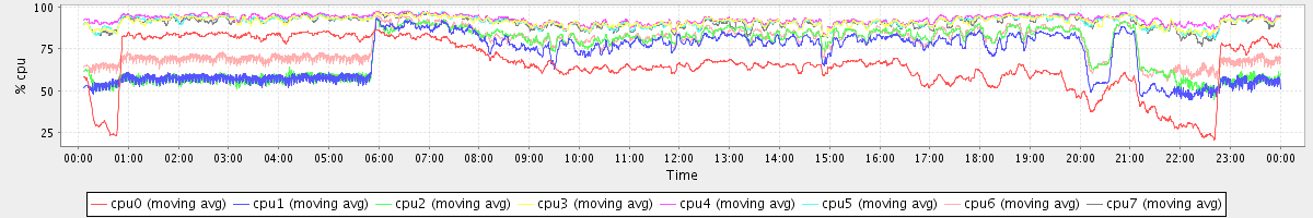 avg(cpu0) = 21.09 avg(cpu1) = 7.48 avg(cpu2) = 6.75 avg(cpu3) = 6.13 avg(cpu4) = 5.14 avg(cpu5) = 5.91 avg(cpu6) = 6.84 avg(cpu7) = 6.37