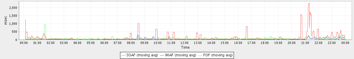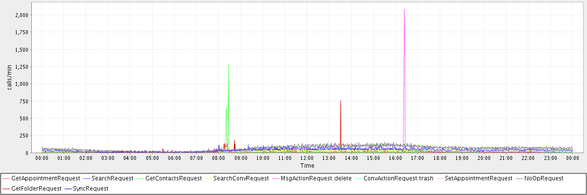 max(GetAppointmentRequest) = 133.00 max(SearchRequest) = 122.00 max(GetContactsRequest) = 1296.00 max(SearchConvRequest) = 96.00 max(MsgActionRequest.delete) = 2084.00 max(ConvActionRequest.trash) = 61.00 max(SetAppointmentRequest) = 66.00 max(NoOpRequest) = 158.00 max(GetFolderRequest) = 754.00 max(SyncRequest) = 113.00