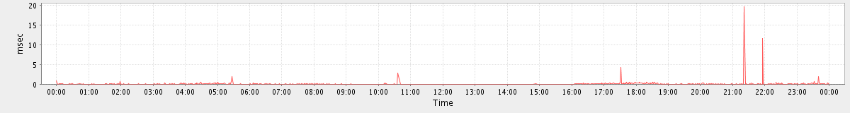 avg(SyncGalRequest) = 3108.98 avg(CreateAppointmentRequest) = 721.76 avg(DeleteAccountRequest) = 11958.00 avg(ImportContactsRequest) = 1255.50 avg(BackupRequest) = 617898.00 avg(FolderActionRequest.empty) = 9164.21 avg(BackupQueryRequest) = 707.71 avg(GetQuotaUsageRequest) = 3058.00 avg(ContactActionRequest.delete) = 708.00 avg(ConvActionRequest.delete) = 1131.07