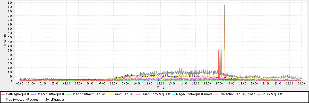 max(GetMsgRequest) = 874.00 max(GetAccountRequest) = 56.00 max(GetAppointmentRequest) = 827.00 max(SearchRequest) = 131.00 max(SearchConvRequest) = 73.00 max(MsgActionRequest.move) = 47.00 max(ConvActionRequest.trash) = 54.00 max(NoOpRequest) = 143.00 max(ModifyAccountRequest) = 56.00 max(SyncRequest) = 71.00