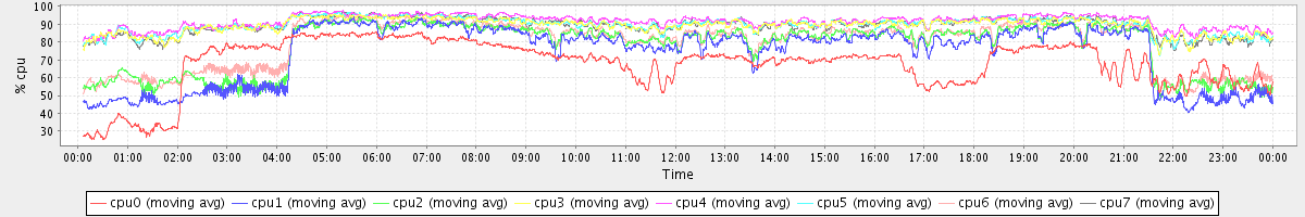 avg(cpu0) = 67.96 avg(cpu1) = 74.07 avg(cpu2) = 77.68 avg(cpu3) = 89.26 avg(cpu4) = 91.61 avg(cpu5) = 89.72 avg(cpu6) = 79.31 avg(cpu7) = 89.30