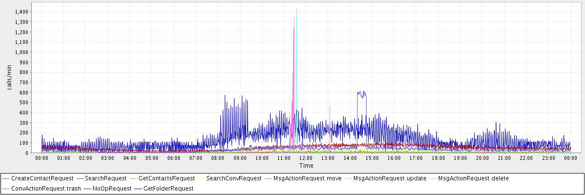 max(CreateContactRequest) = 75.00 max(SearchRequest) = 615.00 max(GetContactsRequest) = 152.00 max(SearchConvRequest) = 63.00 max(MsgActionRequest.move) = 1237.00 max(MsgActionRequest.update) = 1426.00 max(MsgActionRequest.delete) = 1352.00 max(ConvActionRequest.trash) = 47.00 max(NoOpRequest) = 104.00 max(GetFolderRequest) = 572.00