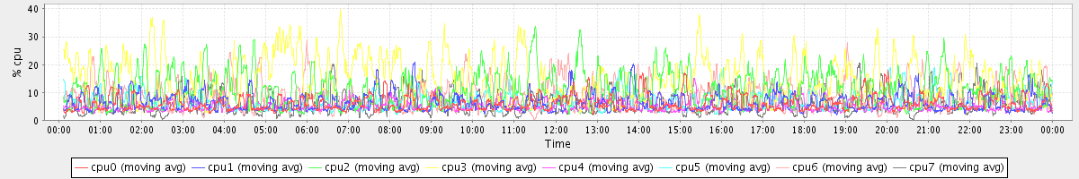 avg(cpu0) = 3.64 avg(cpu1) = 4.61 avg(cpu2) = 12.92 avg(cpu3) = 17.86 avg(cpu4) = 2.30 avg(cpu5) = 4.67 avg(cpu6) = 9.10 avg(cpu7) = 5.46