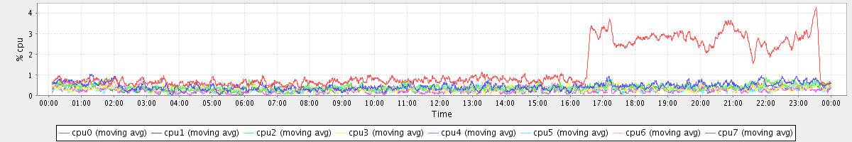 avg(cpu0) = 1.30 avg(cpu1) = 0.43 avg(cpu2) = 0.39 avg(cpu3) = 0.31 avg(cpu4) = 0.24 avg(cpu5) = 0.29 avg(cpu6) = 0.35 avg(cpu7) = 0.30