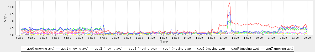 avg(cpu0) = 1.20 avg(cpu1) = 0.23 avg(cpu2) = 0.25 avg(cpu3) = 0.07 avg(cpu4) = 0.17 avg(cpu5) = 0.13 avg(cpu6) = 0.22 avg(cpu7) = 0.07