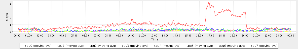 avg(cpu0) = 1.02 avg(cpu1) = 0.22 avg(cpu2) = 0.22 avg(cpu3) = 0.08 avg(cpu4) = 0.08 avg(cpu5) = 0.07 avg(cpu6) = 0.17 avg(cpu7) = 0.08
