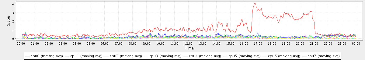 avg(cpu0) = 1.07 avg(cpu1) = 0.21 avg(cpu2) = 0.18 avg(cpu3) = 0.07 avg(cpu4) = 0.08 avg(cpu5) = 0.07 avg(cpu6) = 0.15 avg(cpu7) = 0.08