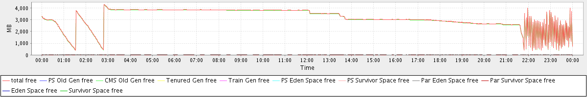 avg(total free) = 3106.43 avg(PS Old Gen free) = 0.00 avg(CMS Old Gen free) = 3085.70 avg(Tenured Gen free) = 0.00 avg(Train Gen free) = 0.00 avg(PS Eden Space free) = 0.00 avg(PS Survivor Space free) = 0.00 avg(Par Eden Space free) = 20.67 avg(Par Survivor Space free) = 0.06 avg(Eden Space free) = 0.00 avg(Survivor Space free) = 0.00