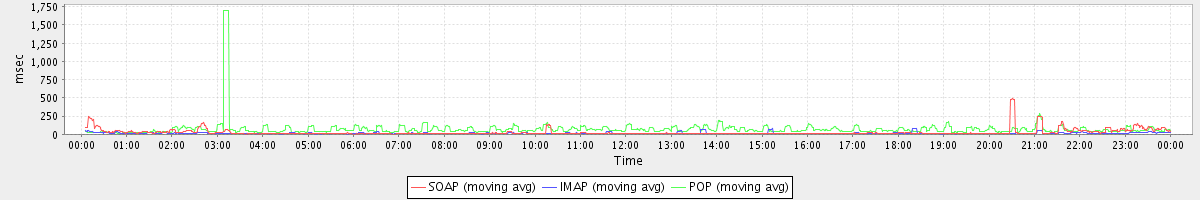 avg(AutoCompleteGalRequest) = 395.60 avg(SyncGalRequest) = 705.11 avg(BackupQueryRequest) = 636.20 avg(BrowseRequest) = 297.00 avg(GetQuotaUsageRequest) = 2965.00 avg(ConvActionRequest.delete) = 596.84 avg(SendMsgRequest) = 423.63 avg(BackupRequest) = 671726.00 avg(FolderActionRequest.empty) = 8304.57 avg(SaveDraftRequest) = 303.69