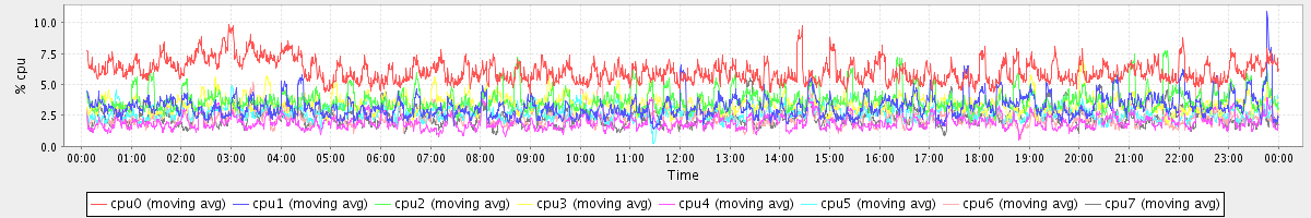 avg(cpu0) = 6.08 avg(cpu1) = 3.22 avg(cpu2) = 3.74 avg(cpu3) = 3.44 avg(cpu4) = 1.95 avg(cpu5) = 2.74 avg(cpu6) = 2.38 avg(cpu7) = 2.35