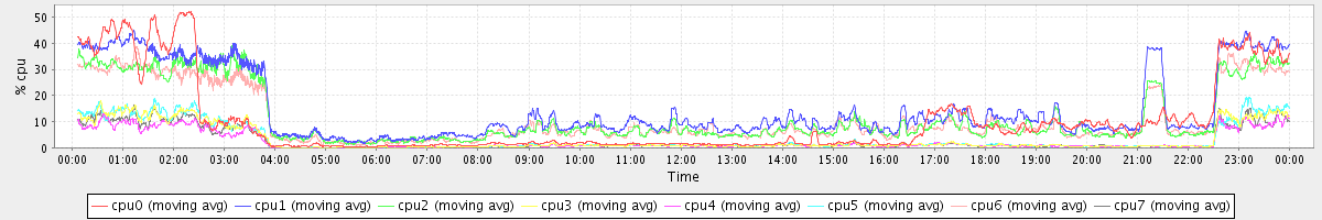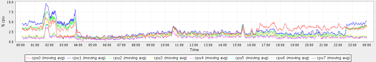 avg(cpu0) = 1.96 avg(cpu1) = 0.82 avg(cpu2) = 0.72 avg(cpu3) = 0.58 avg(cpu4) = 0.40 avg(cpu5) = 0.54 avg(cpu6) = 0.70 avg(cpu7) = 0.56