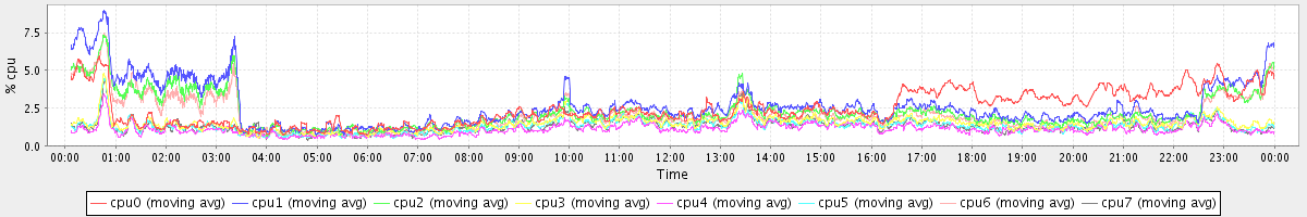 avg(cpu0) = 1.84 avg(cpu1) = 0.81 avg(cpu2) = 0.74 avg(cpu3) = 0.59 avg(cpu4) = 0.41 avg(cpu5) = 0.54 avg(cpu6) = 0.67 avg(cpu7) = 0.56