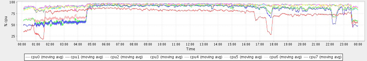 avg(cpu0) = 75.06 avg(cpu1) = 80.99 avg(cpu2) = 82.91 avg(cpu3) = 92.84 avg(cpu4) = 94.35 avg(cpu5) = 93.41 avg(cpu6) = 85.18 avg(cpu7) = 93.29