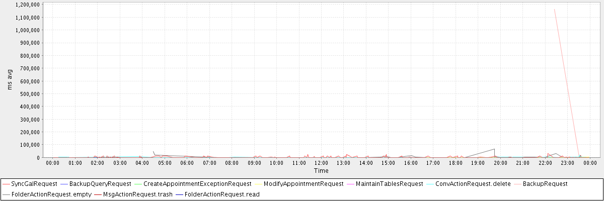 avg(SyncGalRequest) = 2195.63 avg(BackupQueryRequest) = 1403.00 avg(CreateAppointmentExceptionRequest) = 546.00 avg(ModifyAppointmentRequest) = 568.30 avg(MaintainTablesRequest) = 276560.00 avg(ConvActionRequest.delete) = 1680.26 avg(BackupRequest) = 585247.00 avg(FolderActionRequest.empty) = 5538.32 avg(MsgActionRequest.trash) = 571.97 avg(FolderActionRequest.read) = 507.33