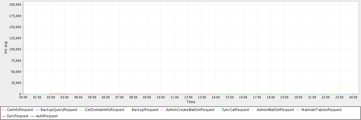 avg(GetInfoRequest) = 2.00 avg(BackupQueryRequest) = 201.00 avg(GetDomainInfoRequest) = 2.12 avg(BackupRequest) = 10358.00 avg(AdminCreateWaitSetRequest) = 26.50 avg(SyncGalRequest) = 152.23 avg(AdminWaitSetRequest) = 1.14 avg(MaintainTablesRequest) = 197428.00 avg(SyncRequest) = 42.00 avg(AuthRequest) = 51.25