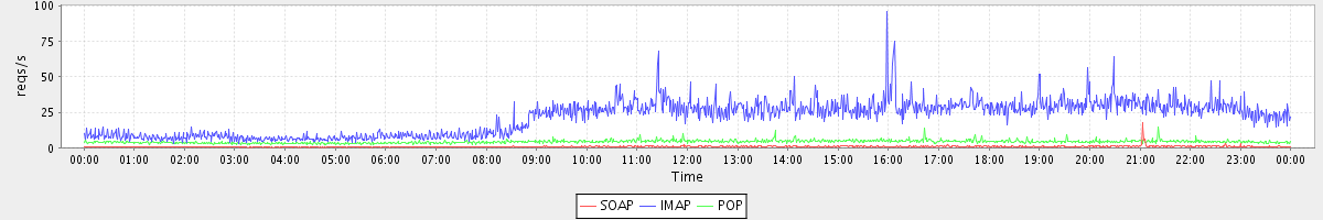 Host zm04.stanford.edu: Mailboxd: Request Rate by Client Protocol