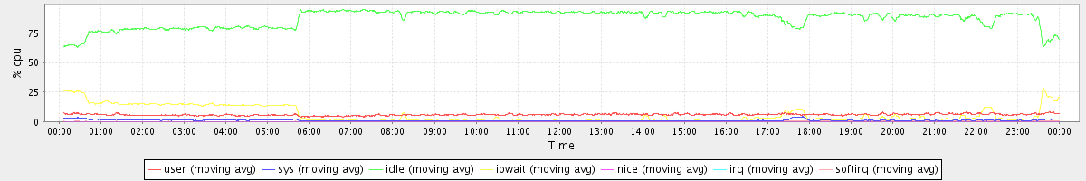 avg(user) = 5.87 avg(sys) = 0.97 avg(idle) = 87.13 avg(iowait) = 5.74 avg(nice) = 0.00 avg(irq) = 0.03 avg(softirq) = 0.26