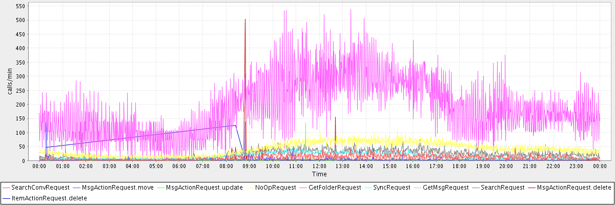 max(SearchConvRequest) = 50.00 max(MsgActionRequest.move) = 139.00 max(MsgActionRequest.update) = 134.00 max(NoOpRequest) = 111.00 max(GetFolderRequest) = 537.00 max(SyncRequest) = 57.00 max(GetMsgRequest) = 45.00 max(SearchRequest) = 100.00 max(MsgActionRequest.delete) = 502.00 max(ItemActionRequest.delete) = 126.00