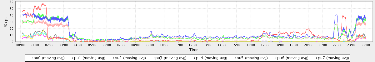 avg(cpu0) = 2.23 avg(cpu1) = 1.78 avg(cpu2) = 1.53 avg(cpu3) = 0.74 avg(cpu4) = 0.64 avg(cpu5) = 0.66 avg(cpu6) = 1.27 avg(cpu7) = 0.68