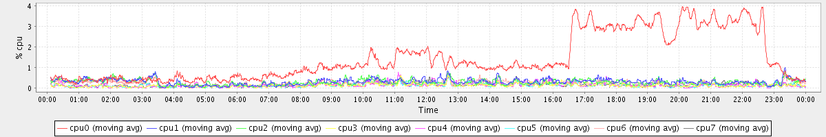 avg(cpu0) = 1.42 avg(cpu1) = 0.30 avg(cpu2) = 0.27 avg(cpu3) = 0.13 avg(cpu4) = 0.14 avg(cpu5) = 0.13 avg(cpu6) = 0.24 avg(cpu7) = 0.15