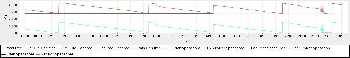 avg(total free) = 3459.29 avg(PS Old Gen free) = 2752.12 avg(CMS Old Gen free) = 0.00 avg(Tenured Gen free) = 0.00 avg(Train Gen free) = 0.00 avg(PS Eden Space free) = 703.21 avg(PS Survivor Space free) = 3.96 avg(Par Eden Space free) = 0.00 avg(Par Survivor Space free) = 0.00 avg(Eden Space free) = 0.00 avg(Survivor Space free) = 0.00