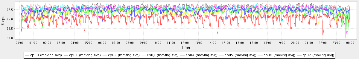 avg(cpu0) = 95.09 avg(cpu1) = 97.21 avg(cpu2) = 96.91 avg(cpu3) = 96.66 avg(cpu4) = 97.42 avg(cpu5) = 97.78 avg(cpu6) = 98.05 avg(cpu7) = 97.92