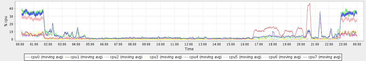 avg(cpu0) = 1.43 avg(cpu1) = 1.05 avg(cpu2) = 0.92 avg(cpu3) = 0.47 avg(cpu4) = 0.35 avg(cpu5) = 0.34 avg(cpu6) = 0.66 avg(cpu7) = 0.29