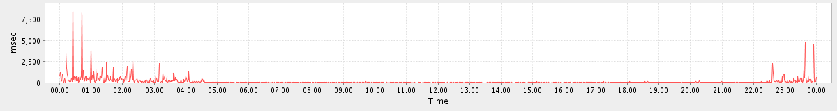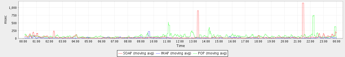 avg(SyncGalRequest) = 613.19 avg(BackupQueryRequest) = 312.20 avg(GetFreeBusyRequest) = 706.50 avg(GetQuotaUsageRequest) = 3157.00 avg(ContactActionRequest.move) = 416.00 avg(ConvActionRequest.delete) = 398.11 avg(SendMsgRequest) = 372.48 avg(BackupRequest) = 241768.00 avg(FolderActionRequest.empty) = 5433.77 avg(SaveDraftRequest) = 211.78