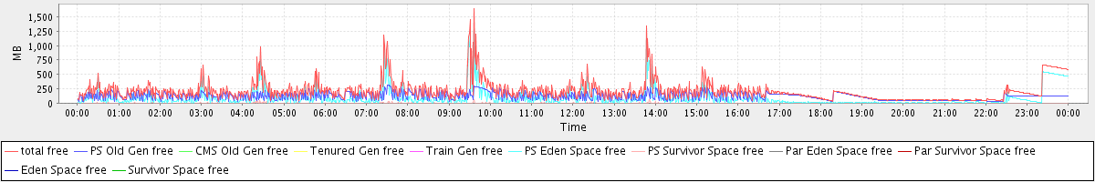 avg(total free) = 211.70 avg(PS Old Gen free) = 119.95 avg(CMS Old Gen free) = 0.00 avg(Tenured Gen free) = 0.00 avg(Train Gen free) = 0.00 avg(PS Eden Space free) = 90.36 avg(PS Survivor Space free) = 1.39 avg(Par Eden Space free) = 0.00 avg(Par Survivor Space free) = 0.00 avg(Eden Space free) = 0.00 avg(Survivor Space free) = 0.00