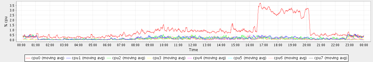 avg(cpu0) = 2.17 avg(cpu1) = 1.49 avg(cpu2) = 1.29 avg(cpu3) = 0.81 avg(cpu4) = 0.57 avg(cpu5) = 0.70 avg(cpu6) = 1.10 avg(cpu7) = 0.63