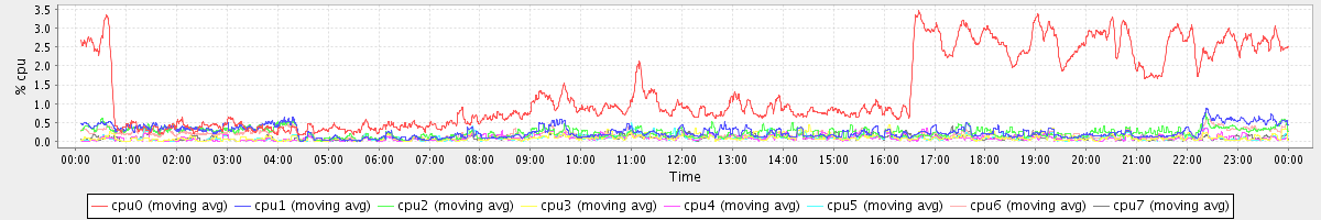 avg(cpu0) = 1.32 avg(cpu1) = 0.25 avg(cpu2) = 0.23 avg(cpu3) = 0.09 avg(cpu4) = 0.08 avg(cpu5) = 0.09 avg(cpu6) = 0.17 avg(cpu7) = 0.09