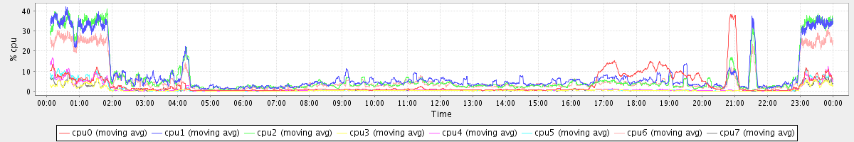 avg(cpu0) = 21.71 avg(cpu1) = 18.74 avg(cpu2) = 18.65 avg(cpu3) = 26.71 avg(cpu4) = 12.13 avg(cpu5) = 22.87 avg(cpu6) = 22.19 avg(cpu7) = 33.87