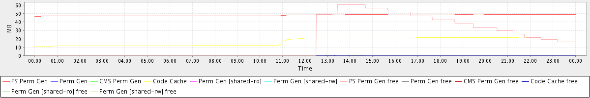 avg(PS Perm Gen) = 48.00 avg(Perm Gen) = 0.00 avg(CMS Perm Gen) = 0.00 avg(Code Cache) = 16.97 avg(Perm Gen [shared-ro]) = 0.00 avg(Perm Gen [shared-rw]) = 0.00 avg(PS Perm Gen free) = 19.30 avg(Perm Gen free) = 0.00 avg(CMS Perm Gen free) = 0.00 avg(Code Cache free) = 0.08 avg(Perm Gen [shared-ro] free) = 0.00 avg(Perm Gen [shared-rw] free) = 0.00
