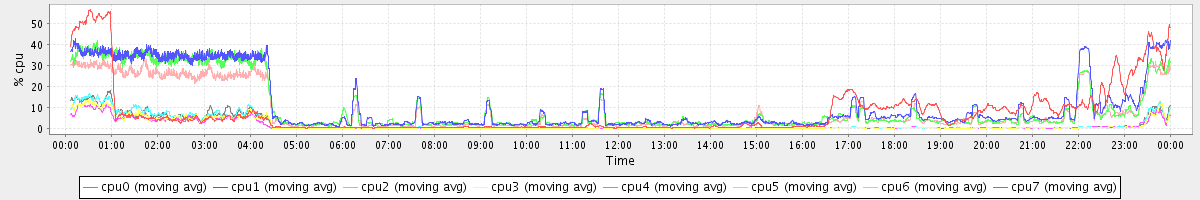 avg(cpu0) = 16.31 avg(cpu1) = 5.86 avg(cpu2) = 5.70 avg(cpu3) = 4.80 avg(cpu4) = 3.69 avg(cpu5) = 4.38 avg(cpu6) = 4.95 avg(cpu7) = 4.94