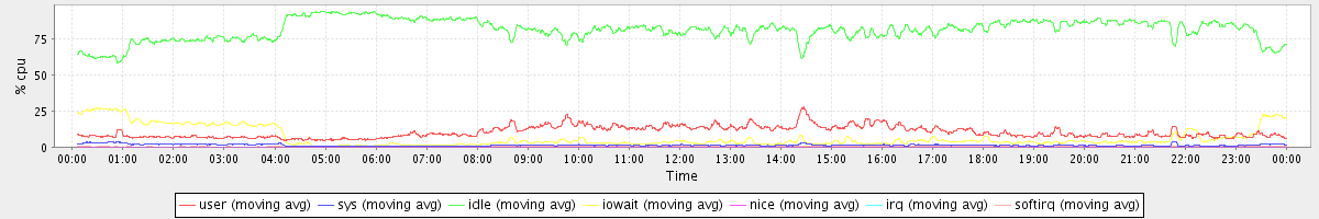 avg(user) = 10.35 avg(sys) = 1.33 avg(idle) = 81.37 avg(iowait) = 6.54 avg(nice) = 0.00 avg(irq) = 0.05 avg(softirq) = 0.37