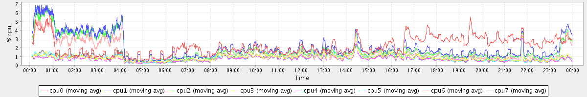 avg(cpu0) = 7.52 avg(cpu1) = 14.15 avg(cpu2) = 11.75 avg(cpu3) = 1.99 avg(cpu4) = 1.69 avg(cpu5) = 2.44 avg(cpu6) = 10.38 avg(cpu7) = 2.36