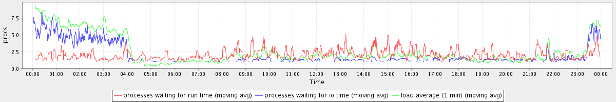 avg(processes waiting for run time) = 1.26 avg(processes waiting for io time) = 1.24 avg(load average (1 min)) = 2.58