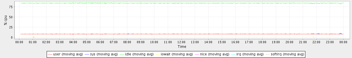 avg(user) = 7.80 avg(sys) = 7.93 avg(idle) = 84.18 avg(iowait) = 0.06 avg(nice) = 0.00 avg(irq) = 0.00 avg(softirq) = 0.00