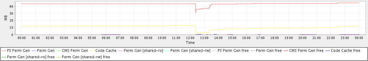 avg(PS Perm Gen) = 43.27 avg(Perm Gen) = 0.00 avg(CMS Perm Gen) = 0.00 avg(Code Cache) = 10.56 avg(Perm Gen [shared-ro]) = 0.00 avg(Perm Gen [shared-rw]) = 0.00 avg(PS Perm Gen free) = 0.10 avg(Perm Gen free) = 0.00 avg(CMS Perm Gen free) = 0.00 avg(Code Cache free) = 0.06 avg(Perm Gen [shared-ro] free) = 0.00 avg(Perm Gen [shared-rw] free) = 0.00