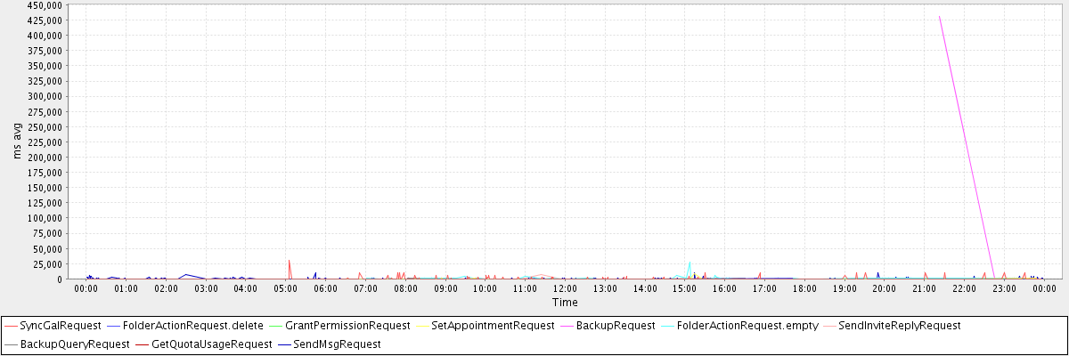 avg(SyncGalRequest) = 355.77 avg(FolderActionRequest.delete) = 339.50 avg(GrantPermissionRequest) = 405.00 avg(SetAppointmentRequest) = 259.48 avg(BackupRequest) = 216244.00 avg(FolderActionRequest.empty) = 1393.92 avg(SendInviteReplyRequest) = 771.55 avg(BackupQueryRequest) = 426.80 avg(GetQuotaUsageRequest) = 3137.00 avg(SendMsgRequest) = 318.54