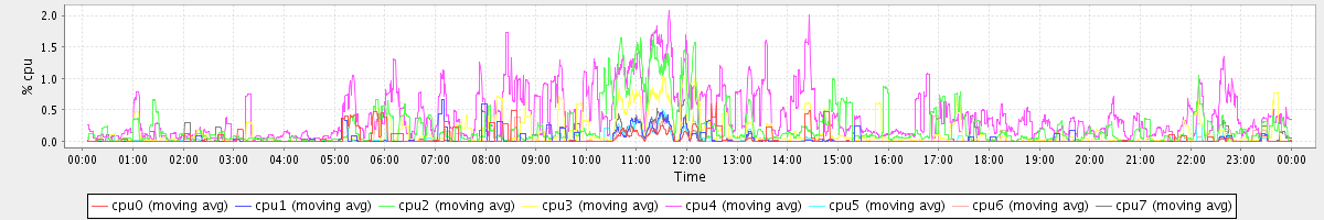 avg(cpu0) = 4.08 avg(cpu1) = 5.80 avg(cpu2) = 12.49 avg(cpu3) = 13.94 avg(cpu4) = 4.63 avg(cpu5) = 5.77 avg(cpu6) = 9.83 avg(cpu7) = 7.29