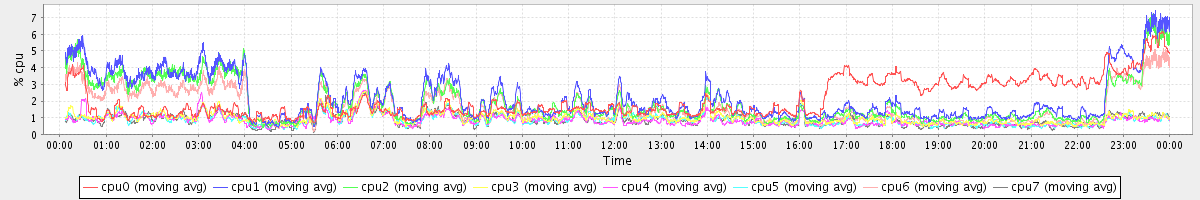 avg(cpu0) = 1.36 avg(cpu1) = 0.50 avg(cpu2) = 0.47 avg(cpu3) = 0.34 avg(cpu4) = 0.29 avg(cpu5) = 0.32 avg(cpu6) = 0.42 avg(cpu7) = 0.33